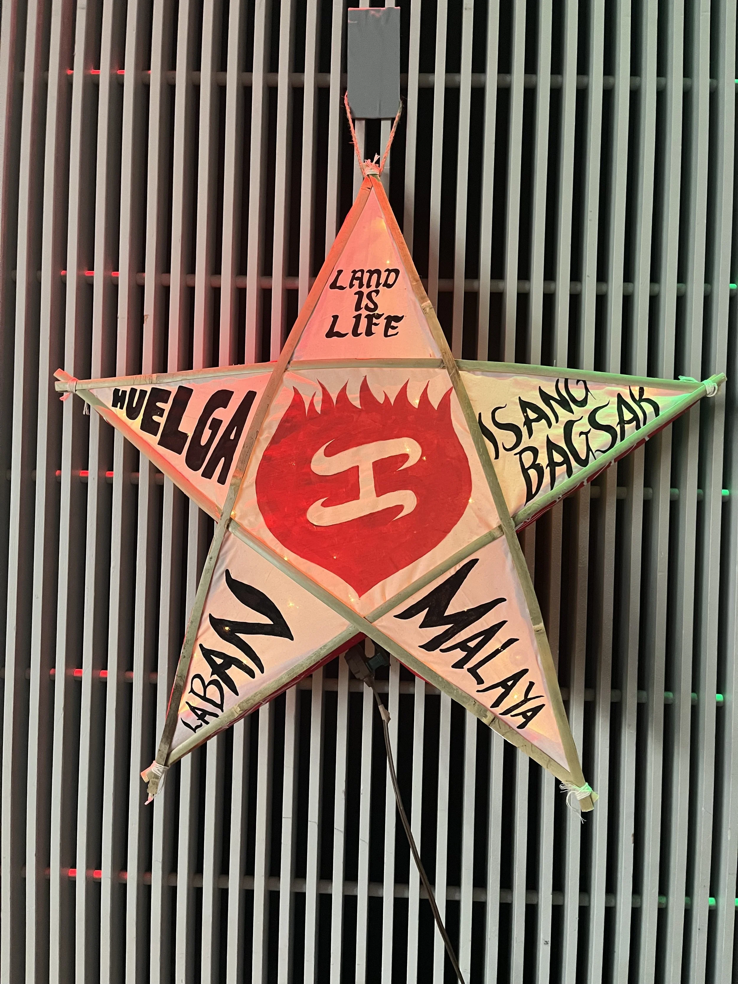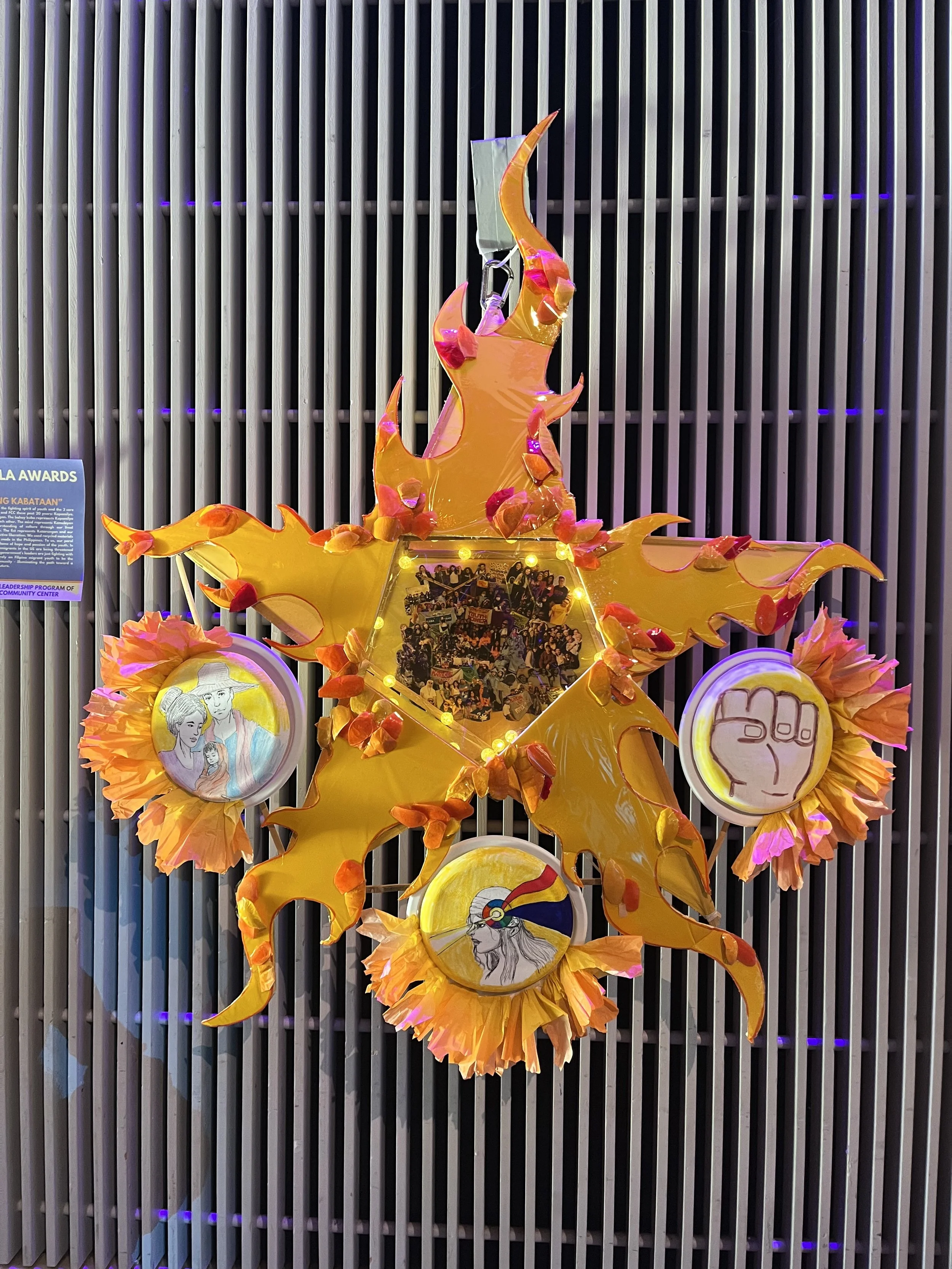 Our parol is “The Fire of Our Resistance,” honoring the history of movements of resistance that inspire organizers today and generations to come. The parol is in black, red, and white, and hangs above a torch. Phrases from movements (laban, huelga, isang bagsak, malaya, and land is life) are on the 5 points with the “ka” symbol in the middle representing “past and present” in baybayin. The torch is lined with a collage of movements. The photos highlight the efforts of the Katipunan, Delano farmworkers, Indigenous Cordillera Peoples, and striking hotel workers. Both have motifs inspired by Filipino culture.
