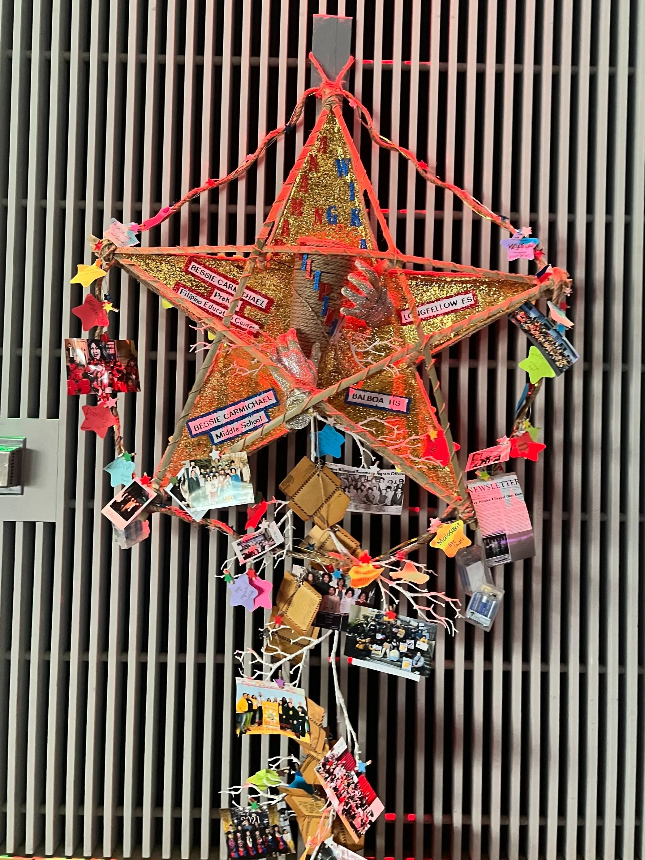 Our parol symbolizes the passing of the Filipino language and linguistic pride to future generations of Filipino/a/x Americans, connecting them to their roots. The adult hand represents the history and legacy of the Filipino Language within the SFUSD, which has thrived for over 50 years. Filipino classes are offered from Kindergarten through 5th grade at Bessie Carmichael/Filipino Education Center and Longfellow and as electives at Bessie Carmichael Middle School and Balboa High School. The smaller hand reaching upward symbolizes the next generation, eager to continue this legacy and ensure the Filipino language thrives for years to come.