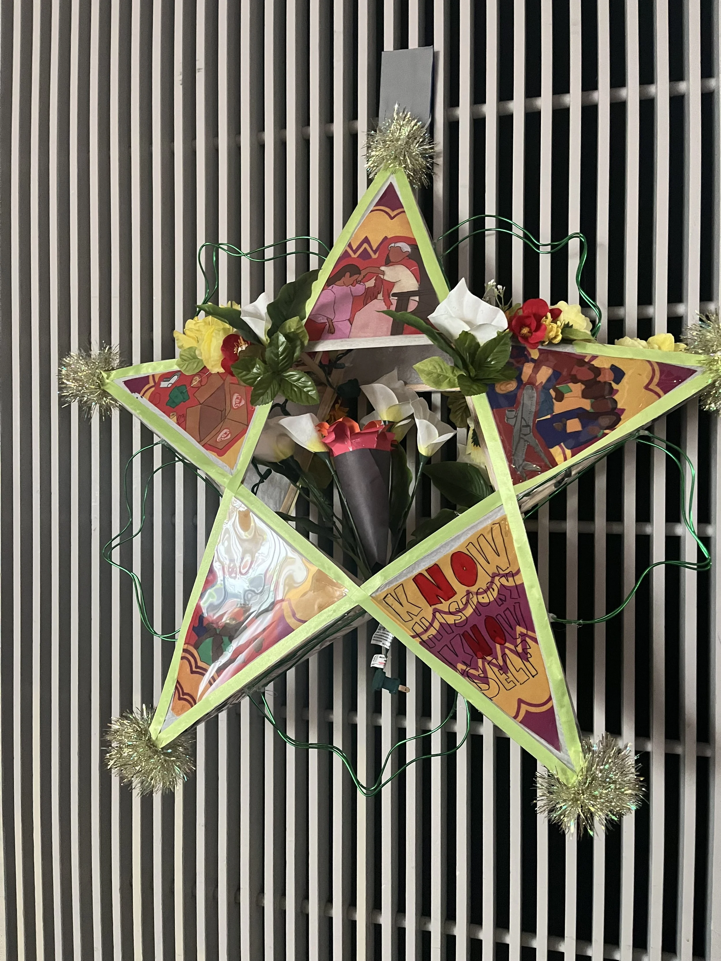 Our parol embodies “Passing the Torch, Forward in Light” by illuminating the connection between generations and cultures. Featuring images, old and new, of our Kapamilya club’s family in the Philippines and San Francisco, it highlights how tradition lights the path for the next generation. The student-painted sections depict different stages of migration to America; from boating voyages to farming, this shows how our people stay connected despite obstacles or challenges. We chose to use fabric on our parol, to symbolize strength and the enduring thread of familial bonds, reflecting the interwoven histories of the Philippines and the U.S.